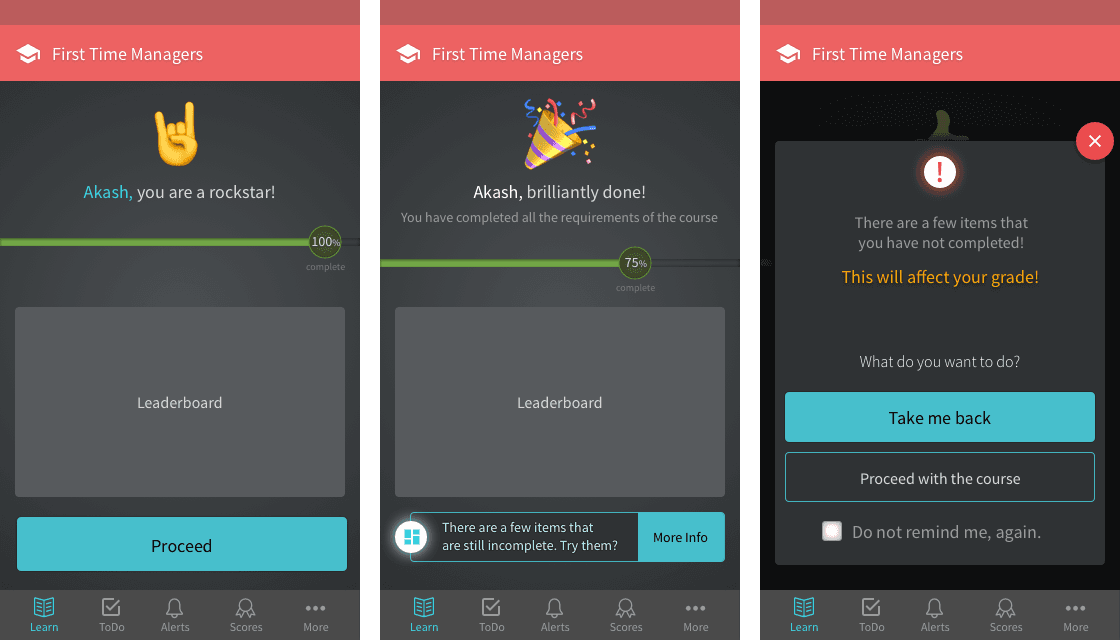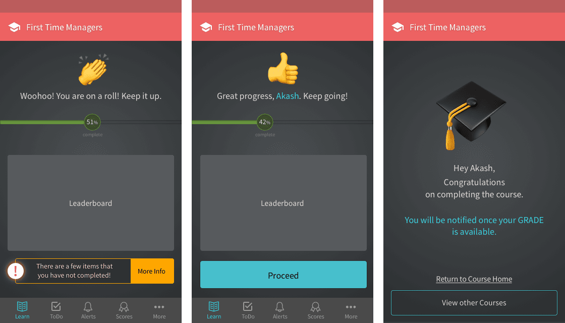Providing encouragement on the path of learning is an important boost that we can provide to learners. In this respect, it is important to show relevant messages that acknowledges the learner’s progress. Coupled with right messaging, I have used emoji 🙌 to achieve a non-serious tone and showing that the system cares about the progress made.
