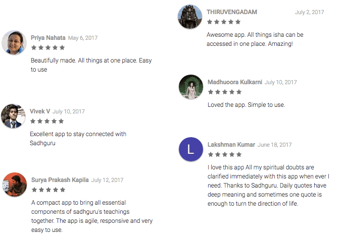 The app received unanimously positive reviews touting that it is extremely simple to use. Isha yoga program registrations have increased by 37%, thanks to the mobile app. Donations through the app were averaging at INR. 200k per month, without any marketing whatsoever. Further improvements to the donation forms were planned in order to make the donation experience even better.