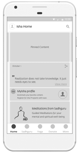 My role was to conceptualise a mobile app given the various offerings of Isha, design the flows and provide direction how it could help the org. in terms of their goals. I was contributing as a UX Lead by working nights, for about 8 hours per week.