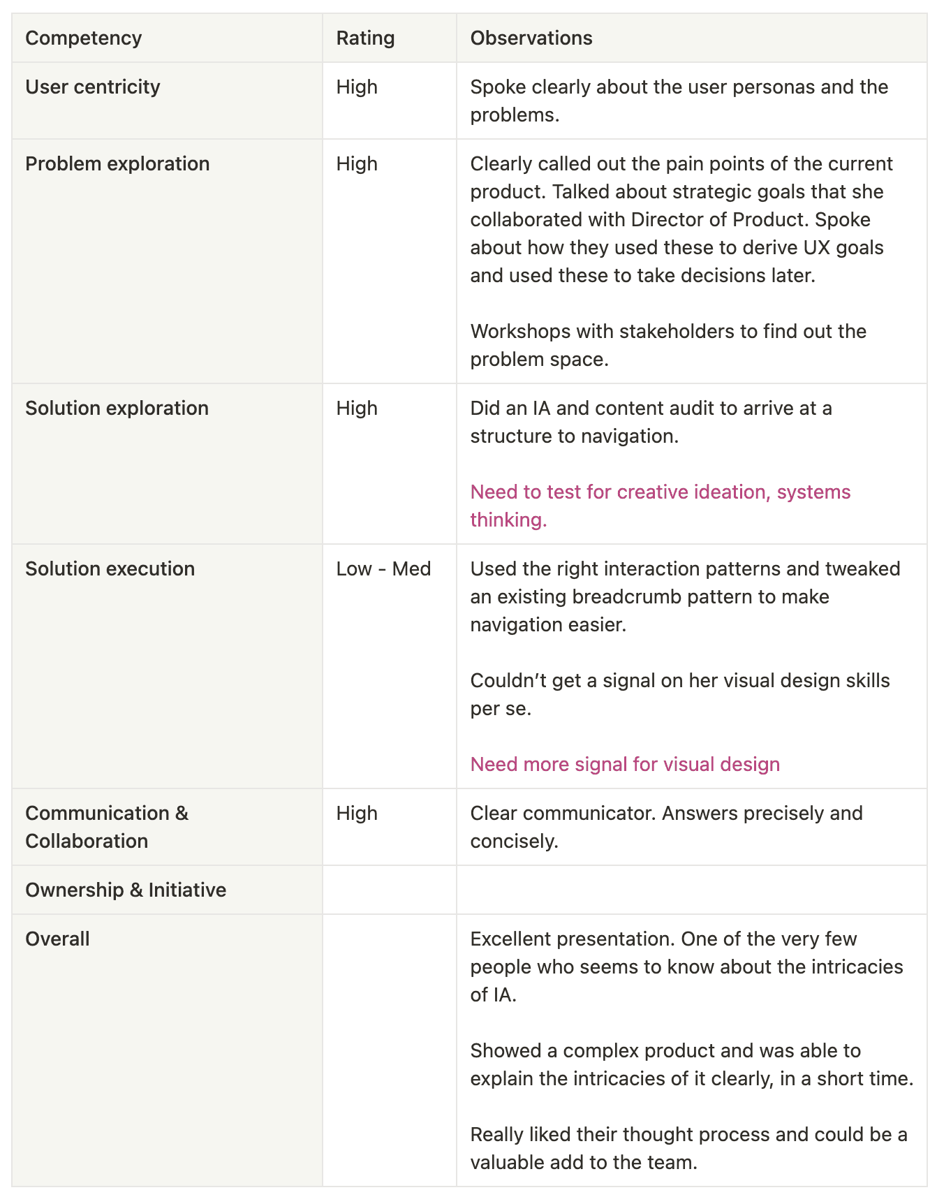 Every interviewer documents their conversation with a candidate against our competencies. Each interviewer can see these notes and understand at a glance how the person has fared, provide structured feedback and also get notes on what they have to test.